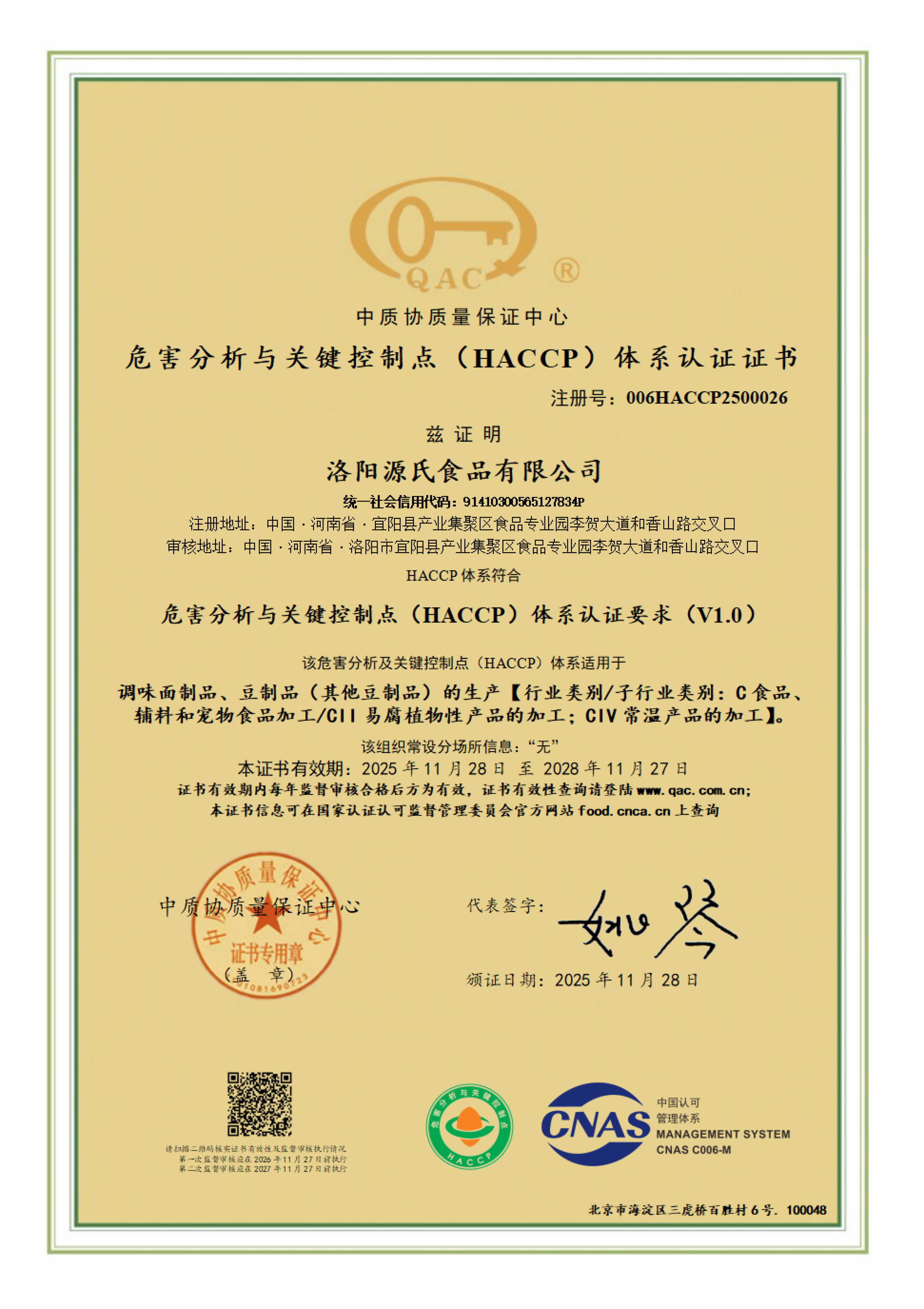 危害分析與關鍵控制點(HACCP)體系認證證書